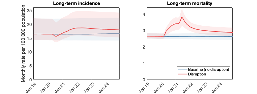 Projections are measured against a baseline scenario (in blue) based on pre-2020 trends. Shaded areas show 95% Bayesian credible intervals.