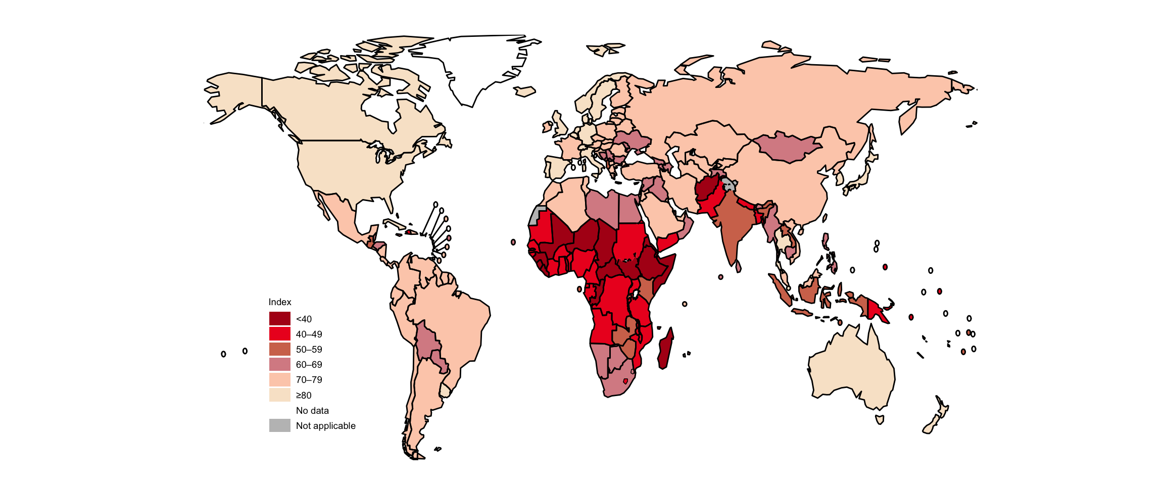 Data for the SCI are currently available for 2000–2017 (Fig. 6.1.1). Globally, the SCI increased steadily in this period, from 45 (out of 100) in 2000 to 66 in 2017. Improvements were made in all WHO regions (especially the Western Pacific Region) and all World Bank income groups. In both 2000 and 2017, low-income and lower-middle-income countries had the lowest SCI values; however, they also had the fastest rate of increase in the SCI. There was little change over time in high-income countries. There is a great deal of variation among countries; in 2017, the highest values were in high-income countries in Asia, Europe and North America, whereas the lowest values were predominantly in countries in the WHO African Region (Fig. 6.1.2).