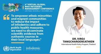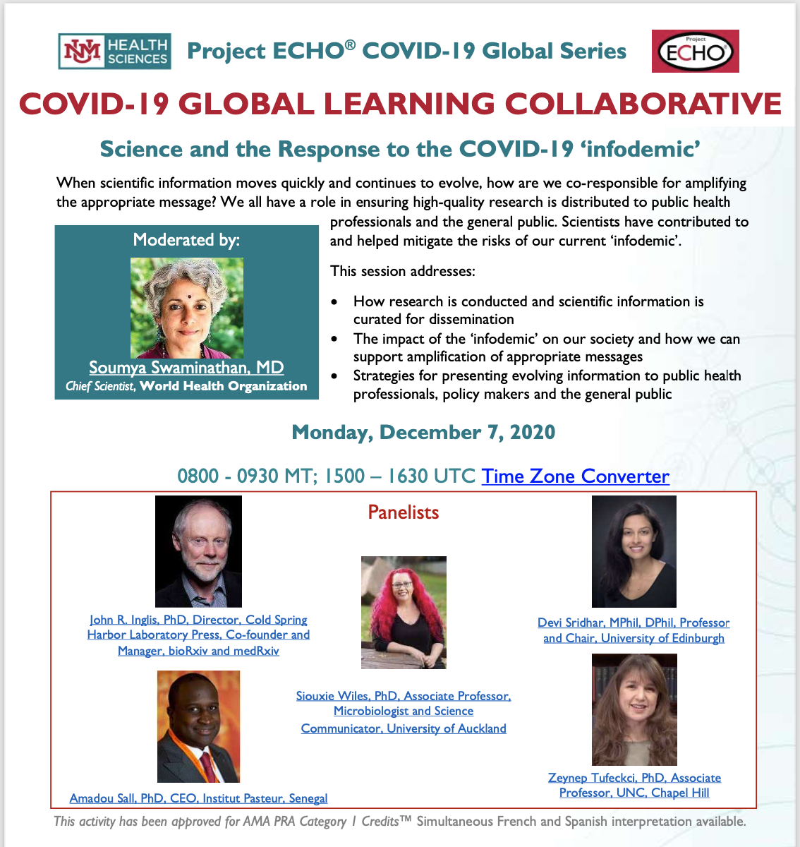 Two panel discussions will be held, the first of which, is to focus on the role scientists play in presenting research findings and how that can inadvertently contribute to the infodemic and country experience of how the scientific community can contribute to the managing of the infodemic. The second, will aim to discuss and summarize challenges and solutions to enhance the quality of research published, how it is curated, and how it can be presented to the general public to improve public understanding of research and how it applies to their lives. Panellists will engage scientists, journal editors, prominent public health advocates, and others across society to address the challenge of communicating high-quality science in a way that people can understand and what it means for how to respond to the COVID-19 pandemic.