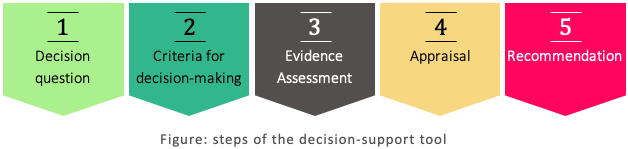 The decision-support tool consists of a comprehensive set of steps from articulating the decision question and convening stakeholders, to identifying decision criteria and deliberating the evidence to come to a recommendation and write a policy brief.